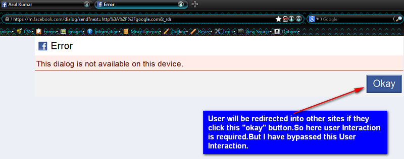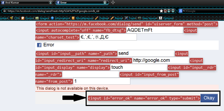 I began analyzing the HTML source code of the page and discovered that the submit button could be made user-controllable. I added another parameter, error_ok, to the URL with an arbitrary value. Fortunately, Facebook’s server processed the Open URL Redirection request without requiring user interaction.