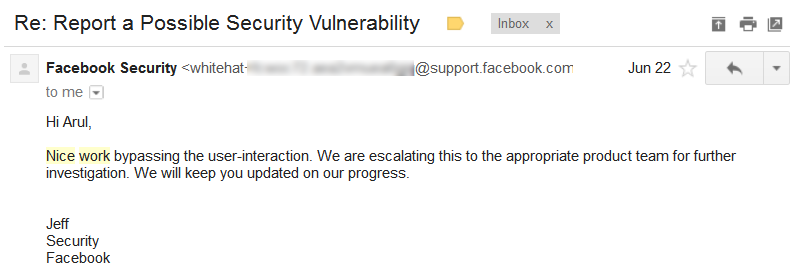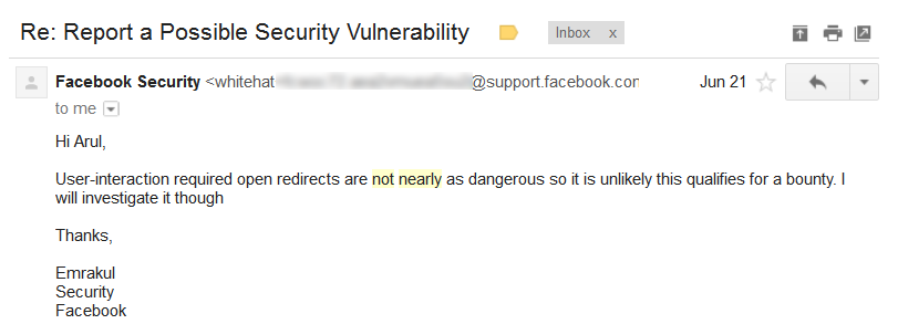 Since the vulnerability required user interaction to perform the open URL redirection, the Facebook Team initially responded negatively, suggesting it might not qualify for a bounty.