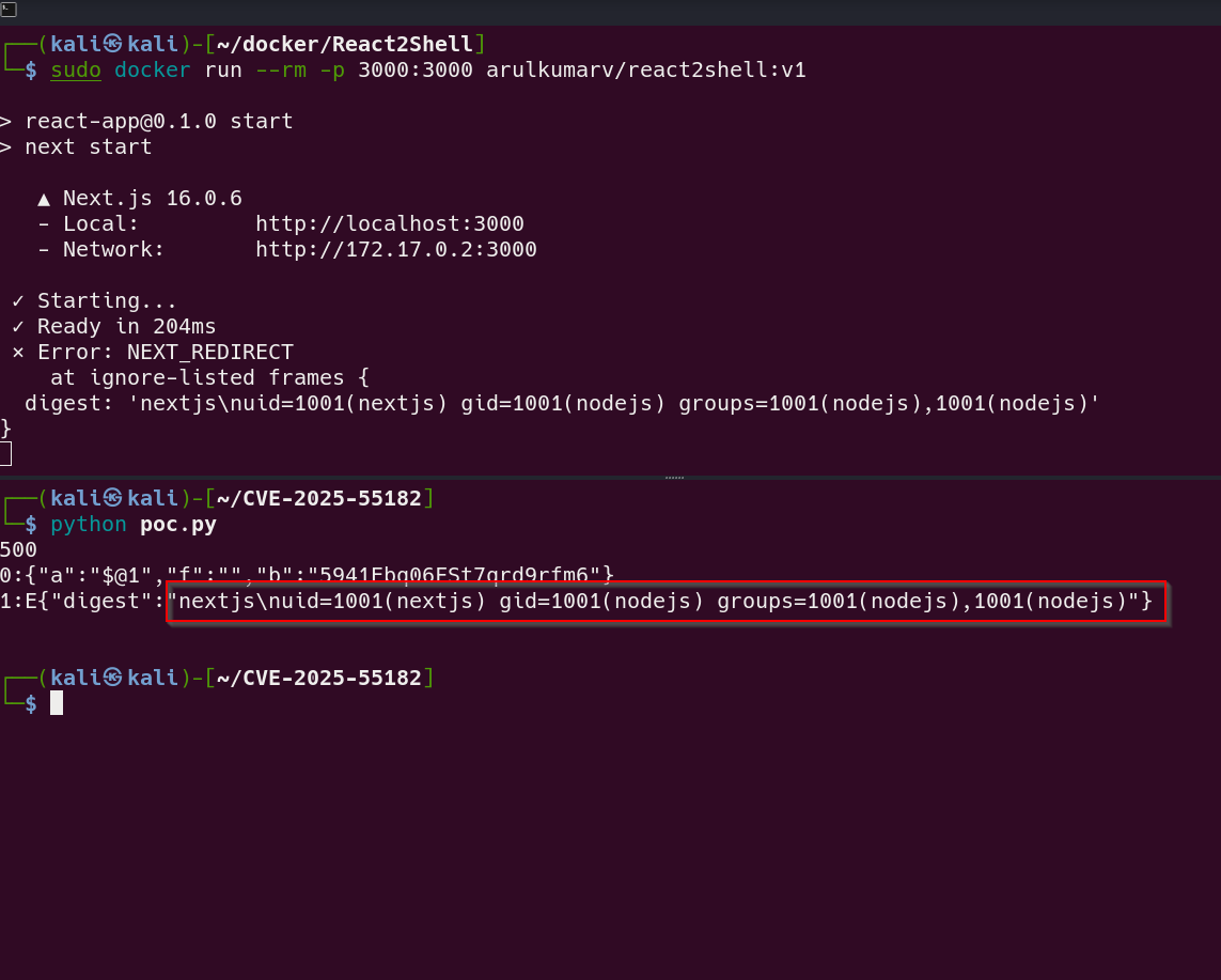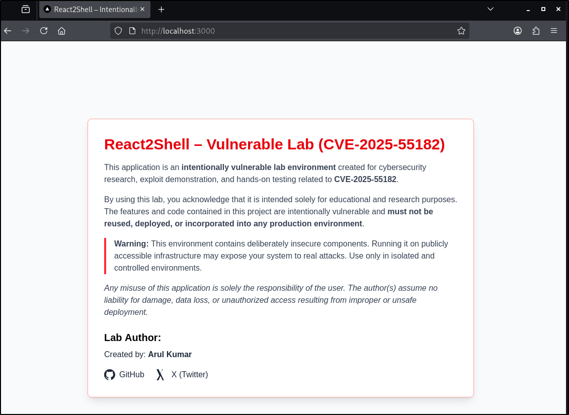 This short post shows how to run the React2Shell vulnerable lab locally using Docker. The instructions are simple and repeatable — ideal for spinning up a disposable environment for learning or testing CVE-2025-55182.